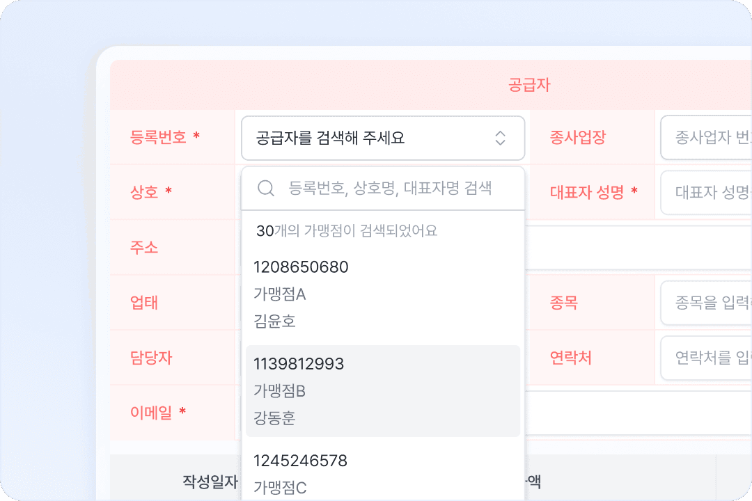 정발행에 필요한 파트너 정보를 자동 수취·관리해 별도 정보 입력 없이 정확한 데이터로 세금계산서를 발행하세요.